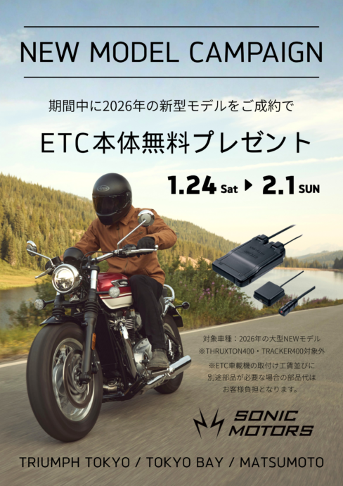 トライアンフ松本 新車情報 試乗車 試乗車一覧 中古車 中古車バイク一覧 アクセサリー クロージング クロージング クロージングカタログ ニュース 新着情報 オーナー様ご紹介 スタッフブログ イベント情報 採用情報 採用情報一覧 求人応募フォーム 店舗情報 店舗情報 お問い合わせ プライバシーポリシー オンラインサービス予約 新車情報 試乗車 試乗車一覧 中古車 アクセサリー クロージング クロージング クロージングカタログ ニュース 新着情報 オーナー様ご紹介 スタッフブログ イベント情報 採用情報 採用情報一覧 求人応募フォーム 店舗情報 お問い合わせ プライバシーポリシー オンラインサービス予約 スタッフ ブログ スタッフブログ ETCキャンペーン開催! 2026年01月17日 ETCキャンペーン開催! 【対象期間】 2026年1月24日(土)~2月1日(日) 期間中、ご成約でETC本体を無料プレゼント! ※取付工賃、別途部品が必要な場合の部品代はお客様負担となります。 お気軽にトライアンフ松本にお問い合わせください🌸 Webストア 前の記事へ