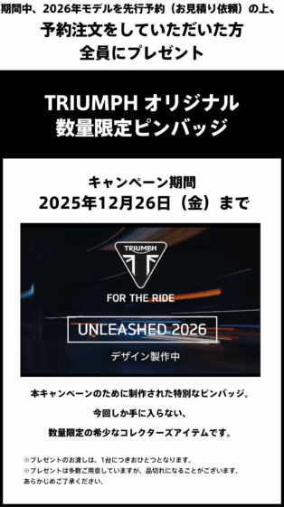 期間中、2026年先行予約(お見積り依頼)の上、予約注文をしていただいた方全員に「TRIUMPH オリジナル数量限定ピンバッジ」をプレゼント